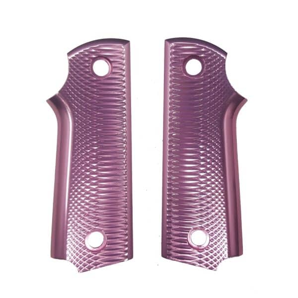 A Tala para pistolas Imbel é totalmente confeccionada em alumínio usinado (CNC) e anodizado em cor rosa metálico, texturizado, oferecendo muita estabilidade e conforto além da beleza.