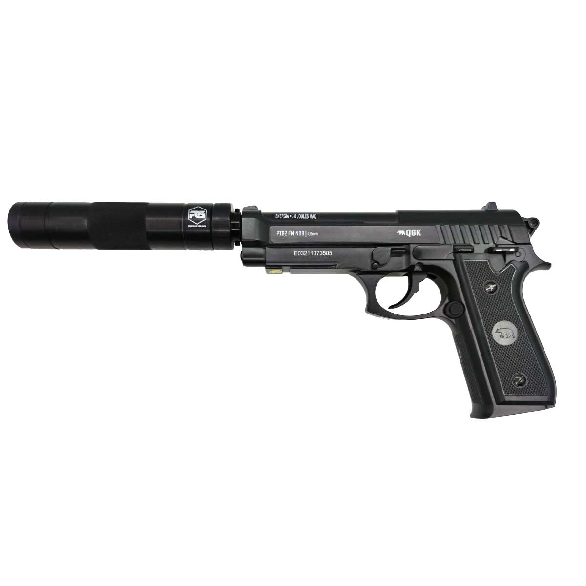 O supressor Prime Guns para pistolas PTs e M9 não possuem revestimento ou câmaras internas, podendo ser colocado, pelo atirador, espumas ou demais itens que auxiliem na redução parcial do ruído do tiro.